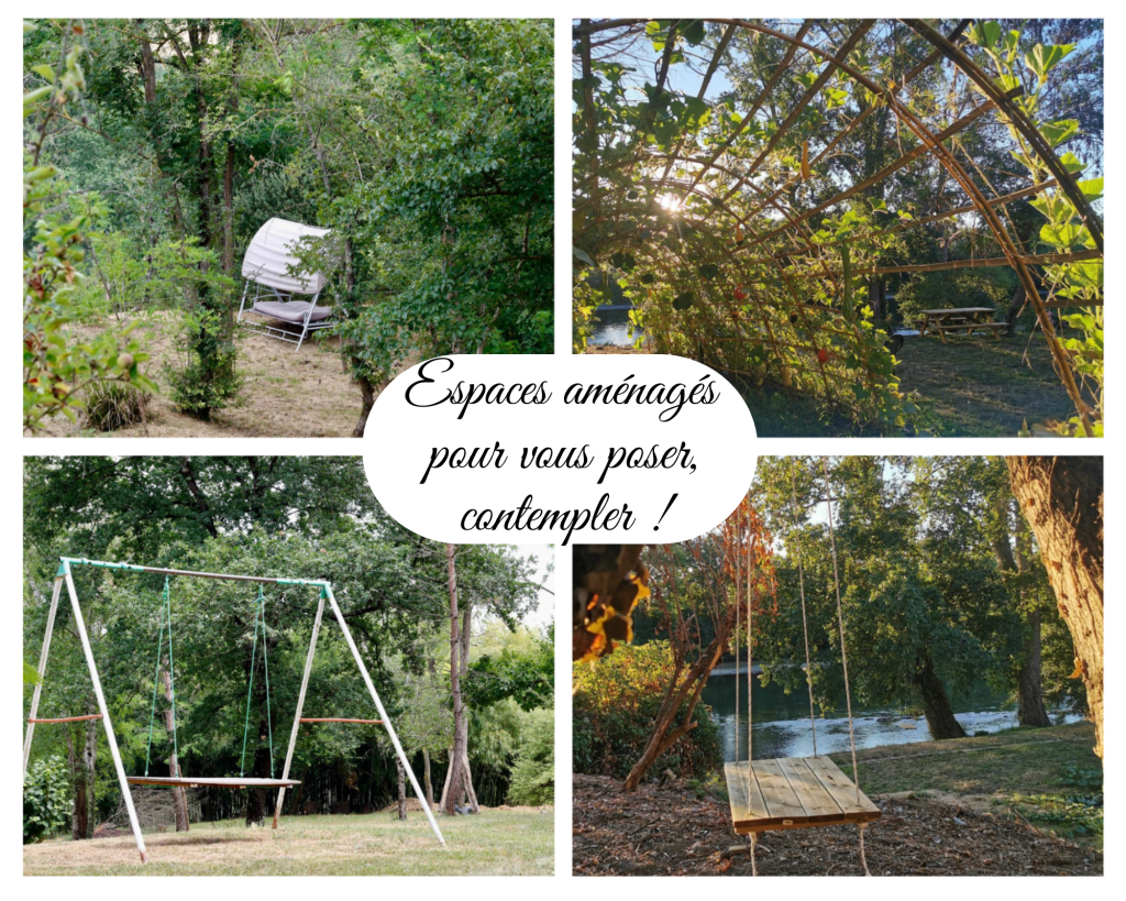 Plusieurs hectares aménagés pour se ressourcer, se balader, avec des hamacs/ transats, des balançoires, coin détente / lecture, parcs avec des animaux ( cygnes, paons blancs)…