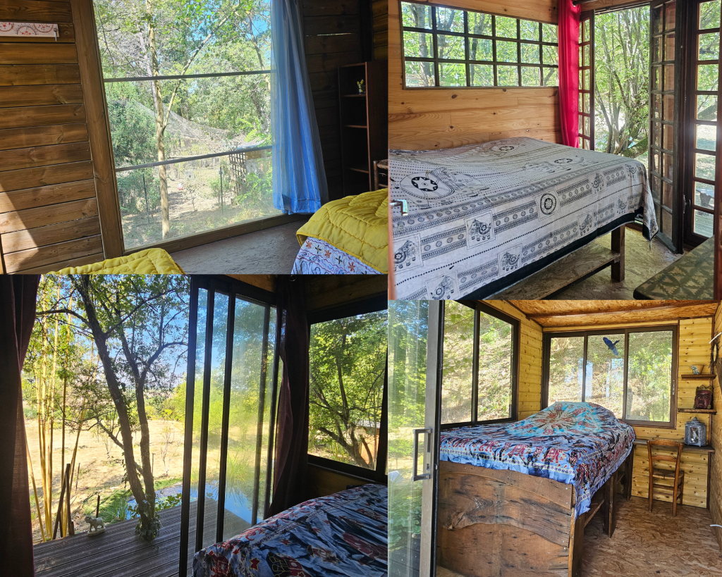• 3 cabanes en bois avec lits doubles sans électricité et sanitaires écologiques.
